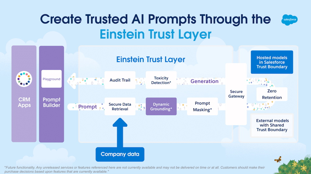 A Salesforce Flow zökkenőmentesen integrálódik és szorosan együttműködik más Salesforce technológiákkal, például az Apex kóddal, Lightning komponensekkel és külső API-kkal, így összetett logika és egyedi műveletek is megvalósíthatók. Az Apex használatával a Flow még inkább testre szabható. Emellett a külső alkalmazásokkal és adatforrásokkal való kapcsolódás lehetővé teszi az üzleti folyamatok automatizálát a Salesforce-on túl is. Salesforce Flow és AI kapcsolódása Prompt grounding