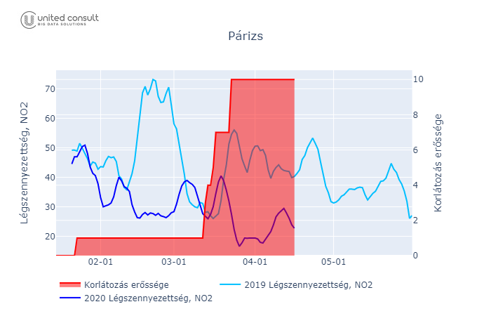 A következőkben láthatjuk a NO2 és a korlátozások kapcsolatát. Az ábrákon feltűntettük a tavalyi és az idei év NO2 koncentrációját januártól kezdve és ezzel párhuzamosan mellé tettük, hogy a különböző városokban mikor, milyen erős korlátozások léptek érvénybe. Jól látható, hogy azokban a városokban, ahol a korlátozások erőssége elérte a legerősebb, 10-es szintet, ott jelentős csökkenést tapasztalunk a tavalyi NO2 koncentrációhoz képest.